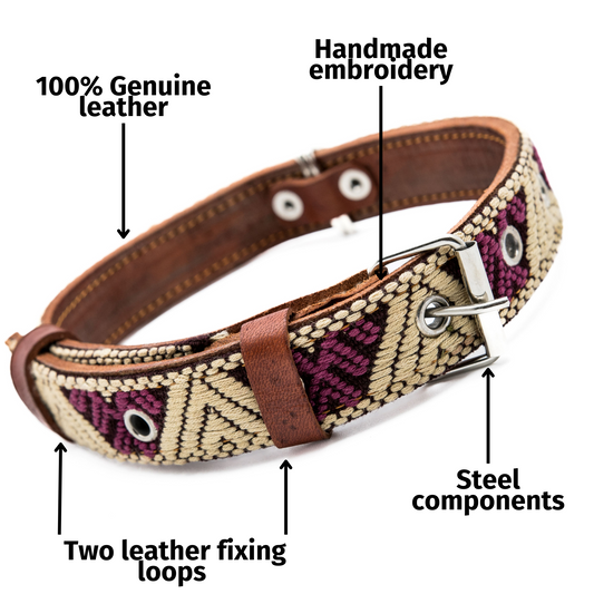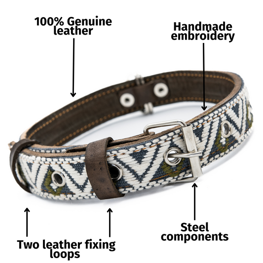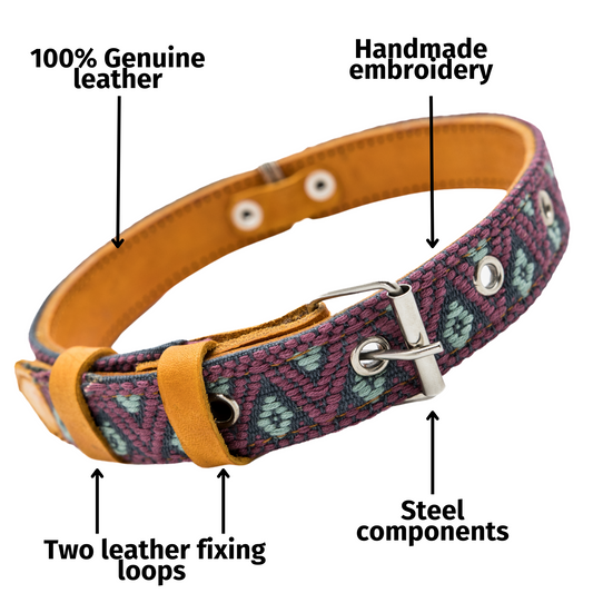 Our collection of handmade dog collars offers a wide variety of boho and Western-inspired designs, each with its own unique meaning and style. The hand-embroidered motifs are not just beautiful but symbolic, adding a personal touch to every collar. Whether your pup wears a small dog collar or a wide dog collar, they will enjoy a unique look that reflects both cultural heritage and individuality. Every collar is crafted to enhance your dog's personality, making them stand out in a truly one-of-a-kind piece.