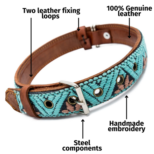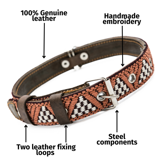 Our handmade leather dog collars combine beauty, durability, and artistry. Each piece is uniquely crafted with intricate embroidery, ensuring your pup stands out in a stylish, one-of-a-kind collar. The delicate craftsmanship reflects the passion and skill of indigenous artisans, creating a collar that not only looks beautiful but also provides lasting comfort and durability. Whether you're seeking a boho dog collar or a Western-inspired design, your dog will look amazing in a collar that embodies both tradition and modern flair.