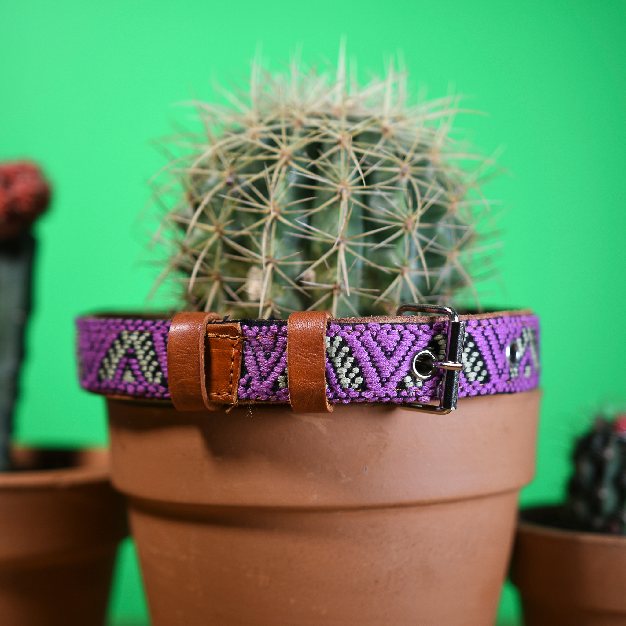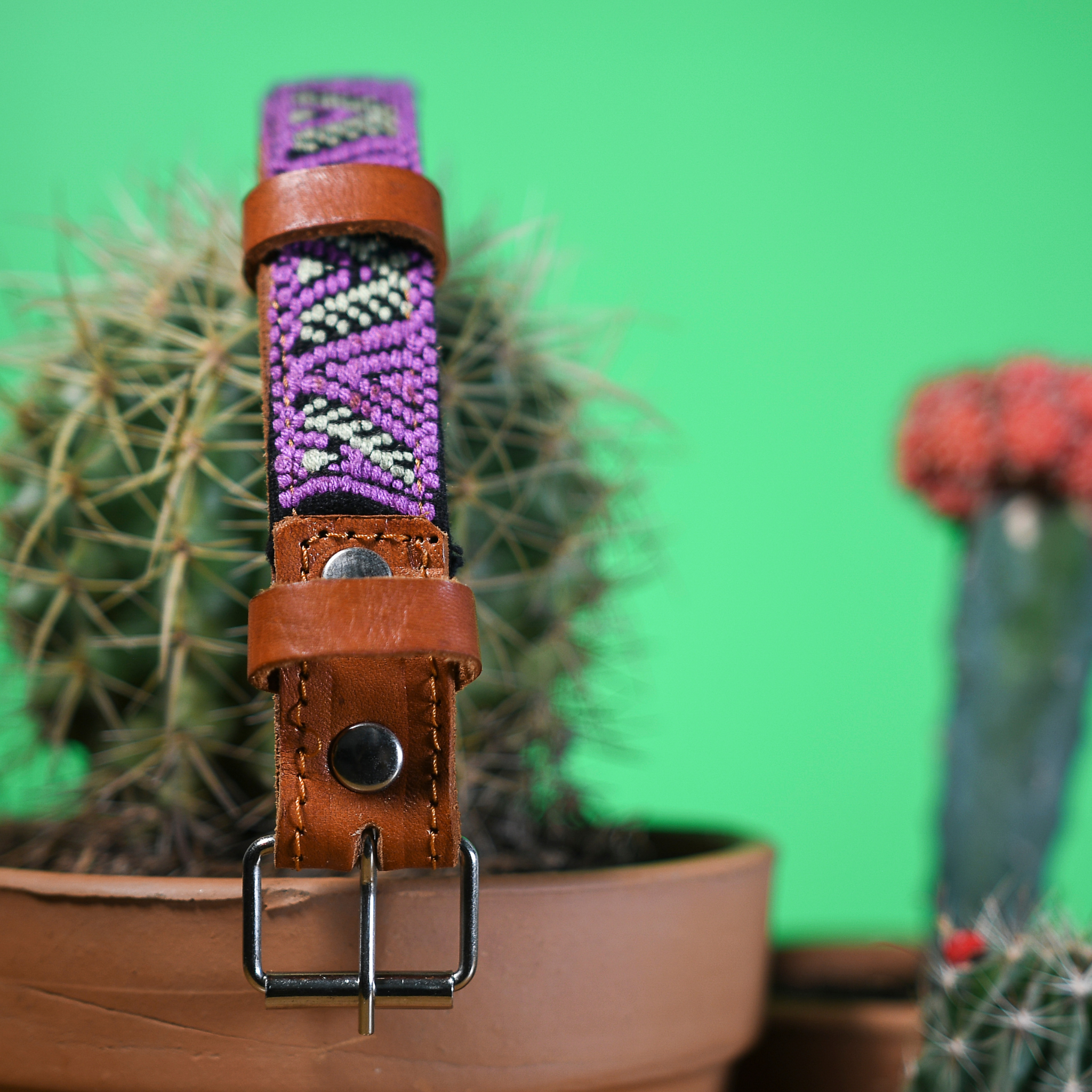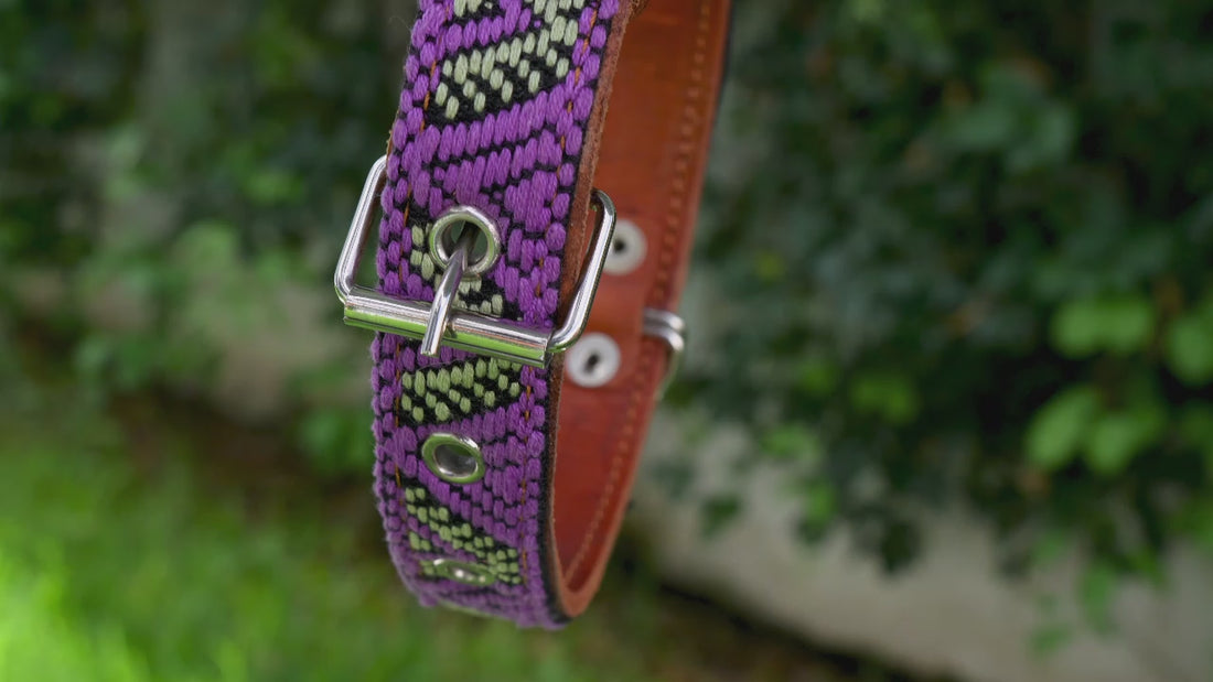 Discover the elegance of our Leather Dog Collar, expertly handcrafted by artisans in southern Mexico. Each collar features a stunning handmade embroidered design created using an ancient Aztec webbing technique, ensuring every piece is as unique as your dog.
