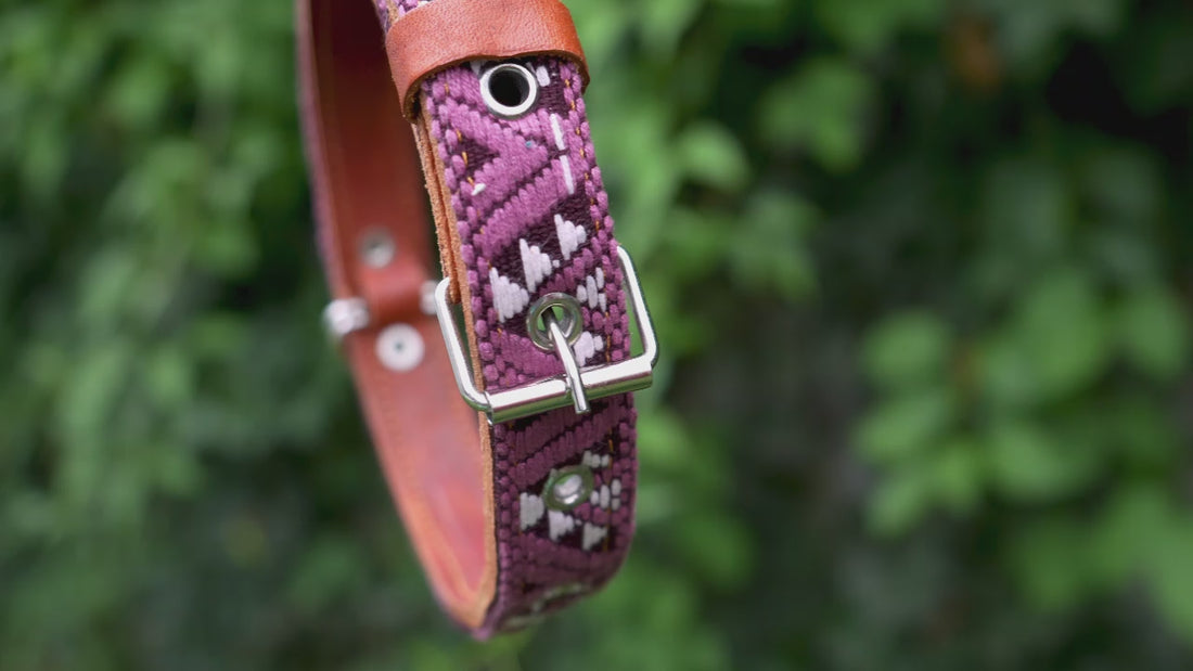 Discover the elegance of our Leather Dog Collar, expertly handcrafted by artisans in southern Mexico. Each collar features a stunning handmade embroidered design created using an ancient Aztec webbing technique, ensuring every piece is as unique as your dog.