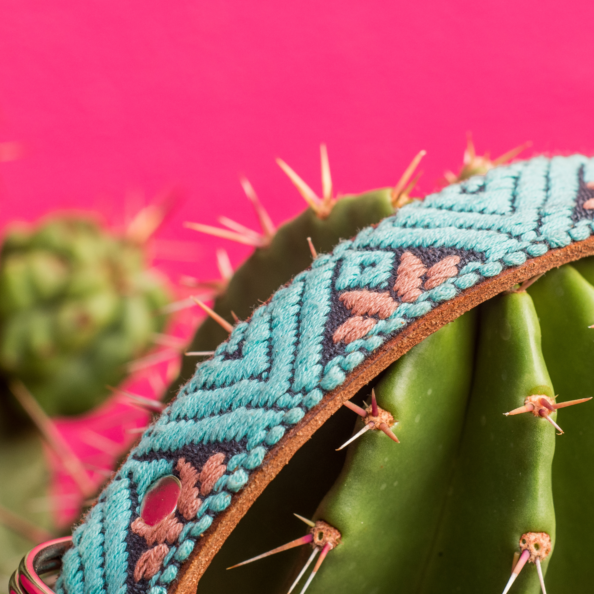 Discover the elegance of our Leather Dog Collar, expertly handcrafted by artisans in southern Mexico. Each collar features a stunning handmade embroidered design created using an ancient Aztec webbing technique, ensuring every piece is as unique as your dog.